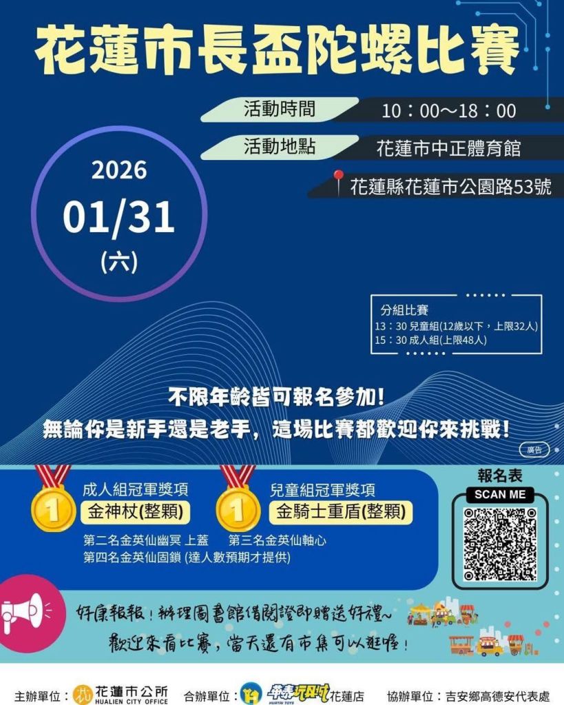 花蓮市長魏嘉彥表示,陀螺活動老少咸宜,不分年齡都能參與其中,透過戰鬥陀螺的交流與對戰,讓大家在歡樂氛圍中找回童年記憶,也凝聚親子情感與社群互動。市長也誠摯邀請市民朋友於1月31日上午10時一同到場觀賽,共同感受陀螺競賽的熱血與樂趣。活動當日,民眾只要至現場圖書館攤位辦理借閱證,即可獲得精美小禮品,數量有限,送完為止。