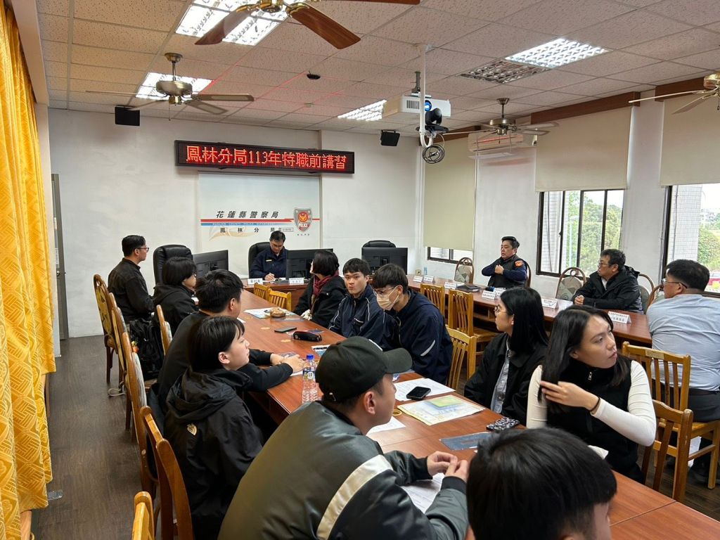 鳳林警分局為讓新進同仁能迅速融入分局團隊,分局長安排職前講習說明會,會中除歡迎接同仁外,提醒同仁注意執勤技巧及執勤三安,期許新進人員能迅速瞭解警察勤業務之運作及推展,並藉各類案件從中獲取寶貴經驗,以同理心熱忱來為民服務;另外期許同仁融入團隊同舟共濟,「守護安全團隊共好」的理念。