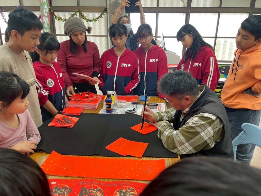 在正式寫春聯前,學生以「永字八法」進行筆畫練習,循序掌握起筆、行筆與收筆的運筆要領。隨著練習上手,孩子從一開始的緊張與生疏,到逐漸能寫出方正清楚、線條穩定的字形,現場不時出現同學互相觀摩、討論字形與構圖的畫面,學習氣氛認真又充滿趣味。
