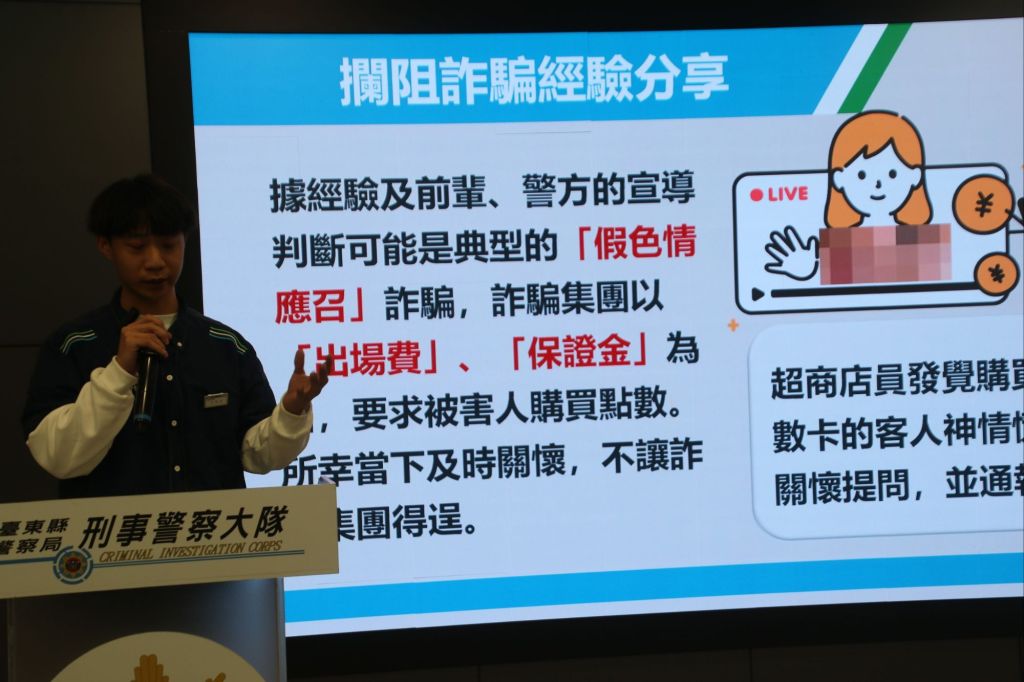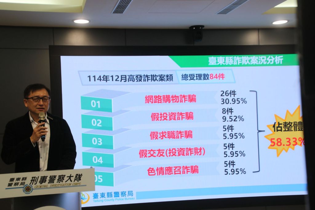 臺東縣警察局林宏昇局長指出,根據內政部警政署165打詐儀錶板顯示,臺東縣於114年12月間共發生84件詐欺案件,總財損為新臺幣1,928.2萬元,前5大高發手法中依序為「網路購物」、「假投資」、「假求職」、「假交友(投資詐財)」及「色情應召詐騙」手法,提醒民眾留意假網路購物詐騙,並解析收到「詐騙包裹」的處理管道;另近期透過色情應召手法詐財案件增加,以誘導民眾購買點數、提供序號等手段取得不法利益,警察局期盼藉此機會與超商聯手宣導,提高大眾識詐知能。