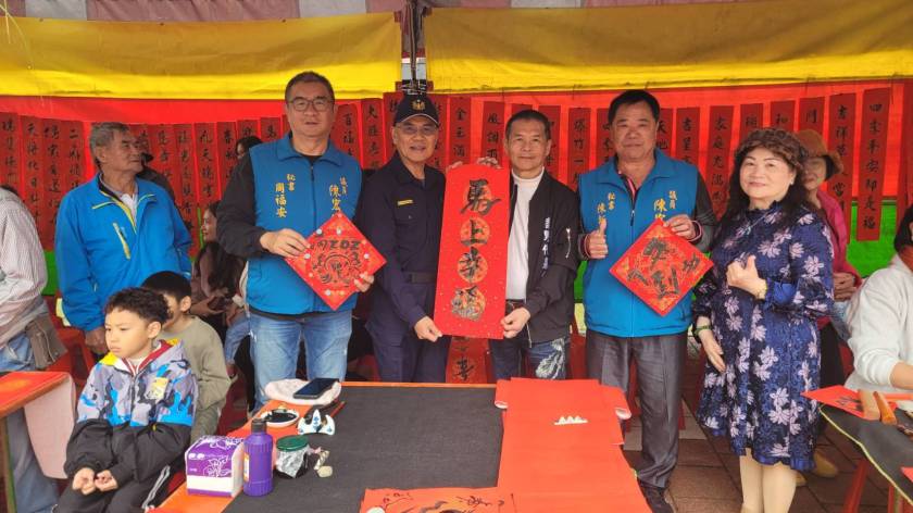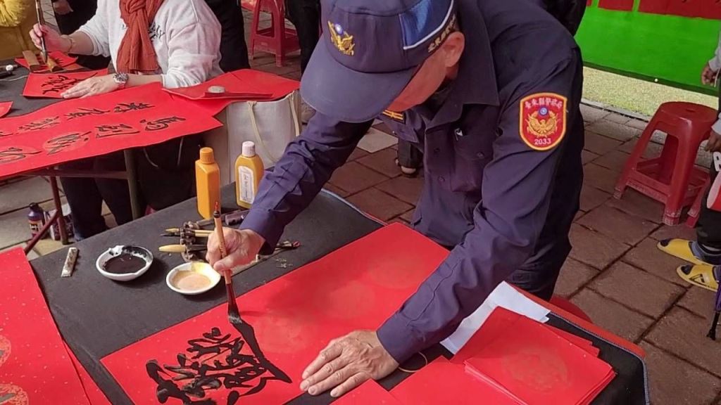 農曆春節將至,為讓鄉親在喜氣洋洋的氛圍中安心迎新年,臺東縣警察局關山分局鹿野分駐所所長陳泰山,於昨(25)日9時許,應邀前往鹿野地區「聖安宮」,參與「迎新春馬到成功全鄉贈春聯活動」,除親自揮毫書寫新春祝福春聯外,並率領所內員警結合大型手舉牌,向民眾宣導防詐騙、交通安全及115年加強重要節日安全維護工作等重點事項,期盼讓鄉親除舊佈新的同時,也能平安過好年。