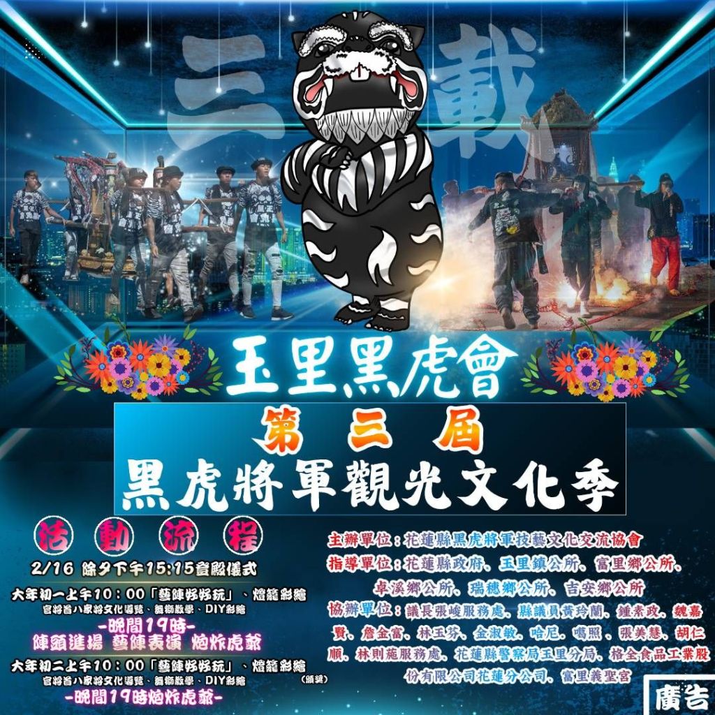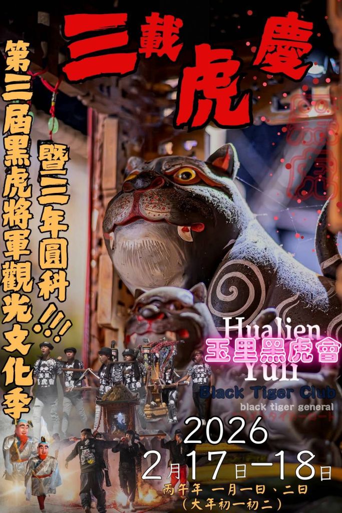 為推廣地方傳統信仰文化與觀光發展,由花蓮縣黑虎將軍技藝文化交流協會主辦的「第三屆黑虎將軍觀光文化季」,將於115年國曆2月17日至18日在玉里圓環盛大舉行。活動結合宗教文化、民俗技藝與觀光特色,邀請全國民眾一同走進玉里,感受黑虎將軍信仰的深厚底蘊。