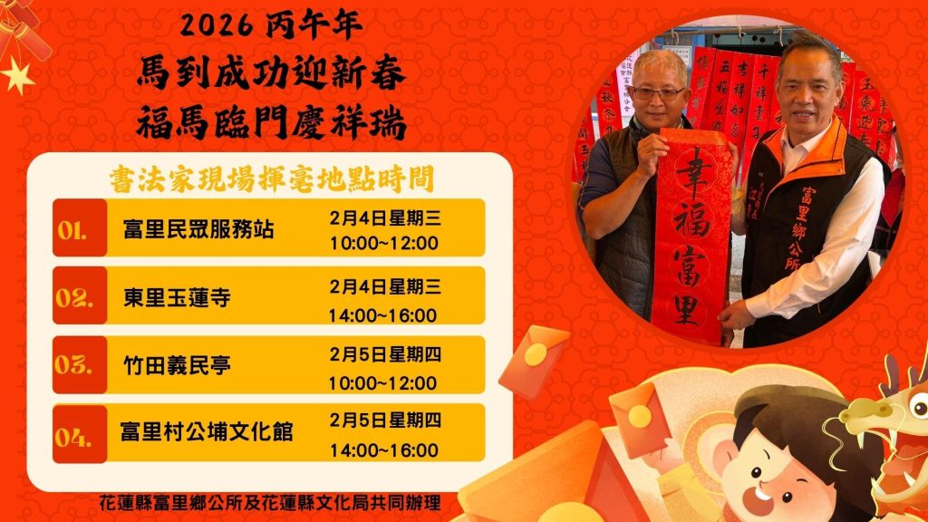 為迎接 2026 丙午年新春佳節,營造喜氣洋洋的年節氛圍,花蓮縣富里鄉公所特別舉辦「2026 丙午年-馬到成功迎新春・福馬臨門慶祥瑞」書法家現場揮毫送春聯活動,誠摯邀請知名書法家杜金模老師、曾興德老師及蔡國昌老師親臨富里鄉,現場揮毫書寫春聯,與鄉親一同迎新納福,傳遞書法藝術之美與新年的祝福。