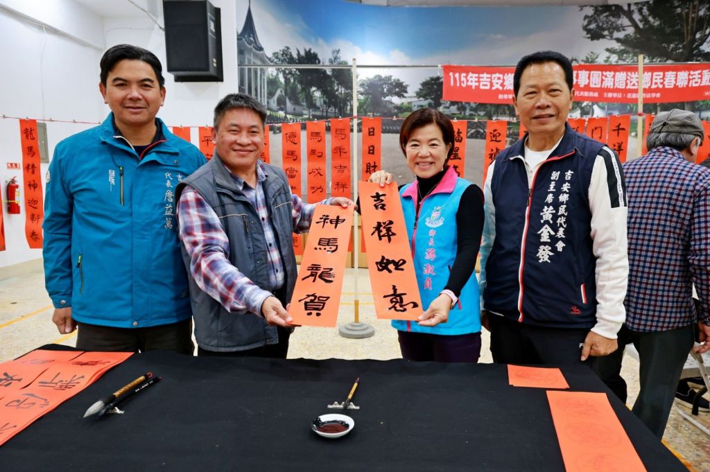 現場,花蓮縣書法學會理事長曾興德率同多位書法名家到場揮毫,為鄉親現場書寫春聯。鄉長游淑貞亦應民眾熱情索要,親自揮毫寫下「吉祥如意」、「馬上加游」等寓意吉祥的墨寶,向鄉親送上新春祝福,現場氣氛熱絡歡樂。