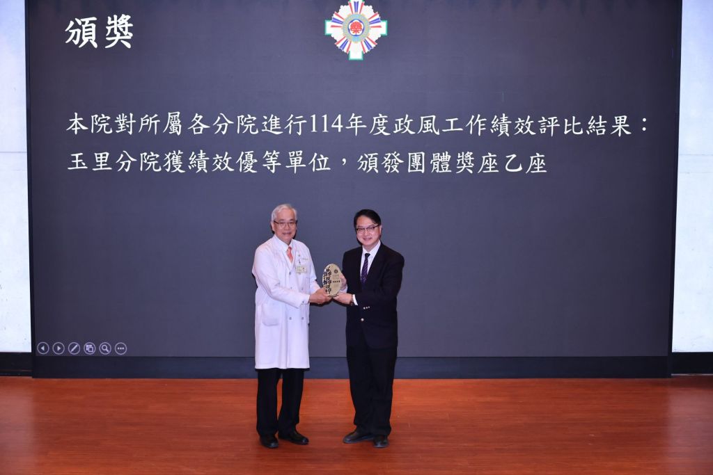 臺北榮民總醫院於日前召開擴大院務會報,會中由陳威明院長親自主持頒獎典禮,頒發「114年度政風工作績效評比績優單位」獎座予北榮玉里分院胡宗明院長。此項殊榮不僅肯定了北榮玉里分院在廉政業務上的紮實耕耘,更展現了此院在提升醫療服務品質的同時,對於建立行政透明環境的堅持與精進。