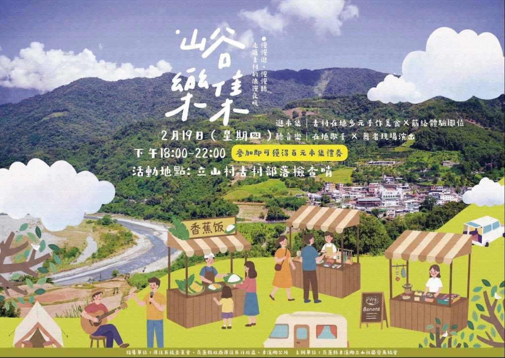近年戶外音樂活動逐漸盛行,為回應部落青年及族人對音樂文化的熱忱,花蓮縣卓溪鄉立山社區發展協會將於115年2月19日(星期四)晚間18時至22時,在立山村古村部落檢查哨舉辦「初三.山谷樂集」戶外音樂市集活動,邀請民眾走進山谷,感受音樂與部落生活交織的夜晚。