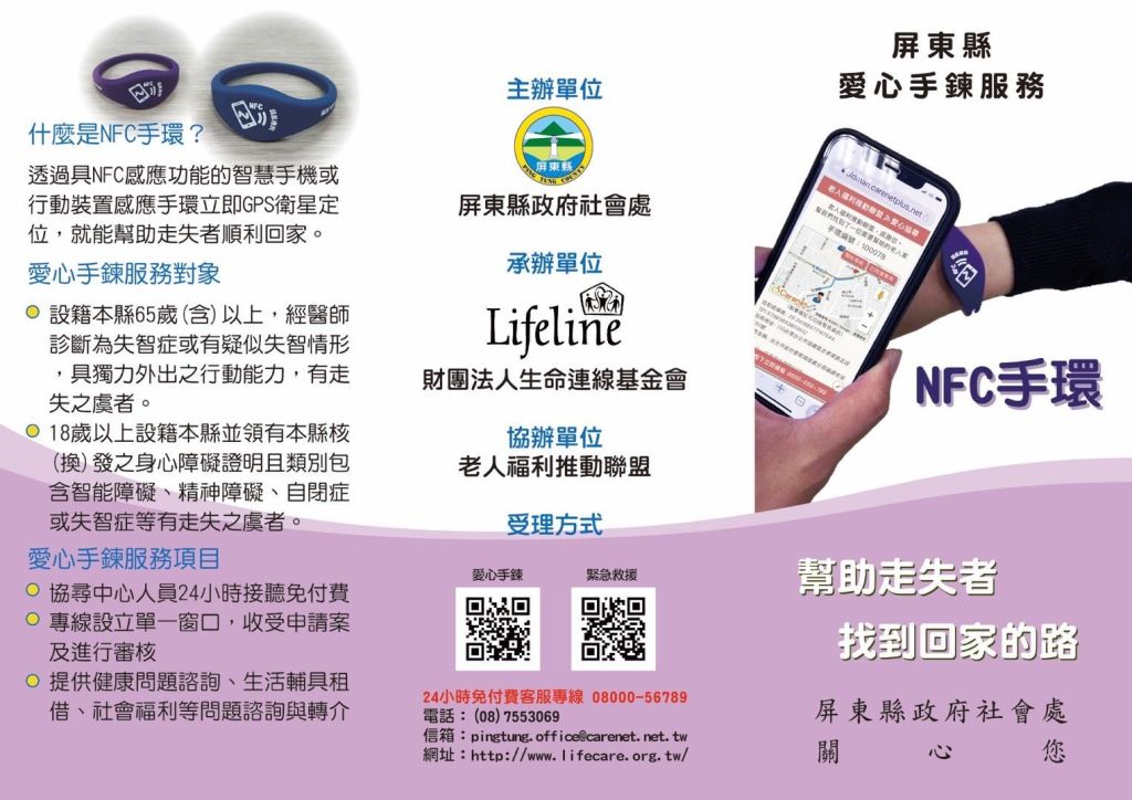 凡設籍屏東縣65歲(含)以上,經醫師診斷為失智症或有疑似失智情形,具獨力外出之行動能力,有走失之虞者;18歲以上設籍屏東縣並領有核(換)發的身心障礙證明且類別包含智能障礙、精神障礙、自閉症或失智症等有走失之虞者,都可以跟社會處申請。可透過屏東縣政府便民服務整合申辦平台線上辦理或親洽「財團法人生命連線基金會屏東辦公室」辦理,電話:08-7553069,亦可洽屏東縣政府社會處電話:(08)7320415#5511。