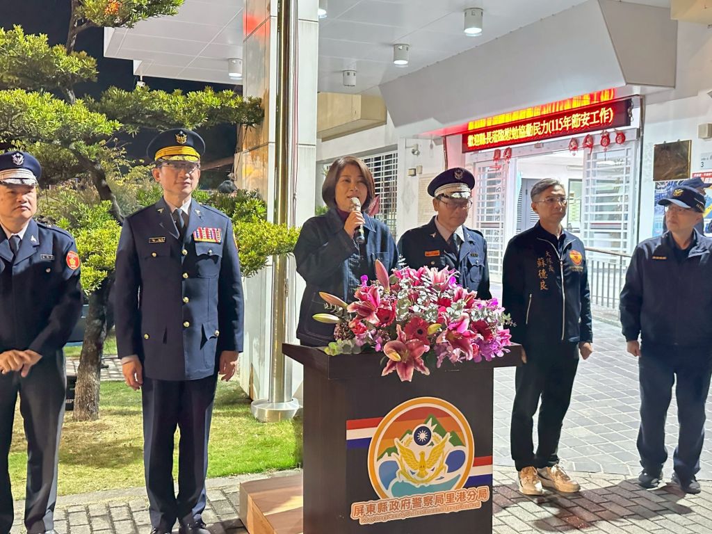 為感謝警政民力於春節期間全力投入治安與交通維護工作,屏東縣長周春米於2月8日晚間前往屏東縣政府警察局里港分局,慰問執行「115年加強重要節日安全維護工作」的第一線人員,向民防、義警、義交、志工及守望相助隊等民力夥伴表達誠摯感謝,並致贈慰問金,肯定大家的辛勞付出。