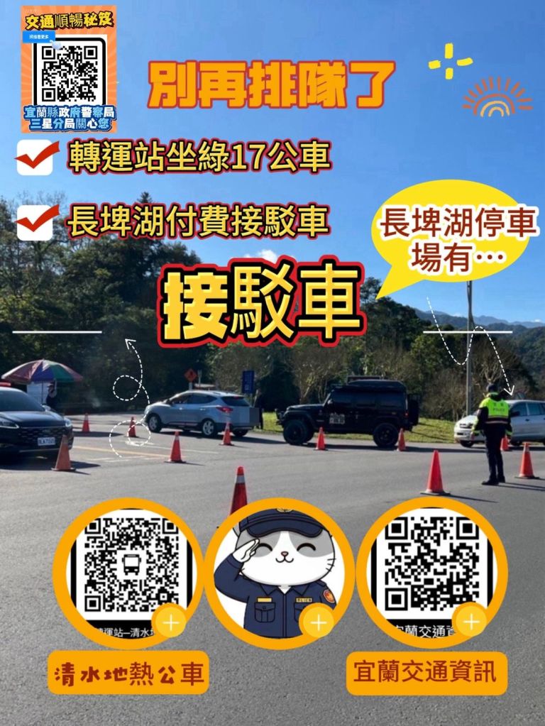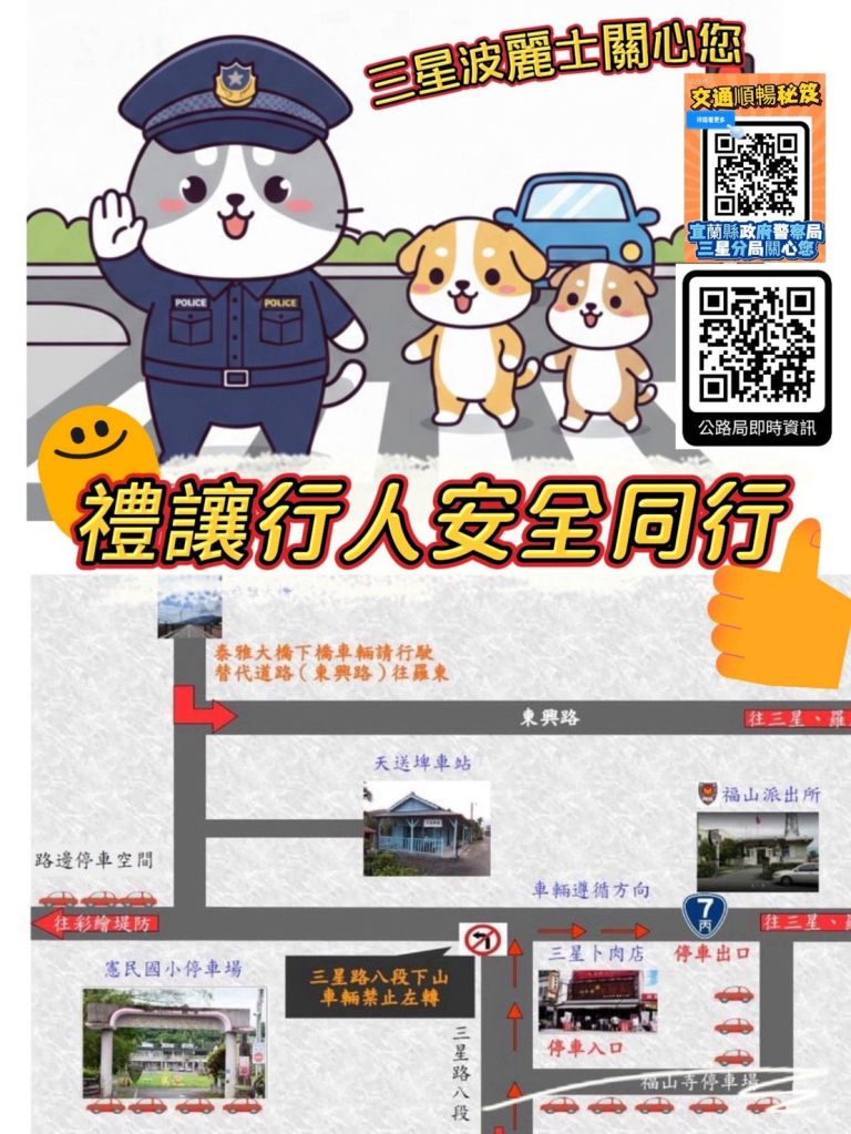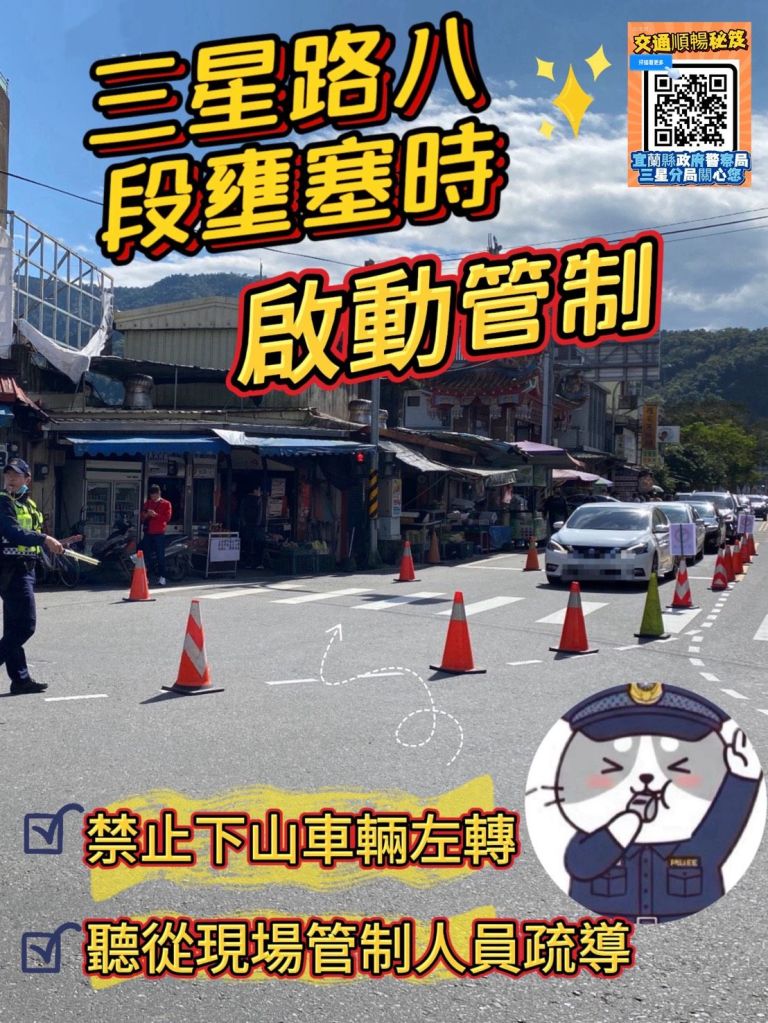 三星警分局提醒,連假期間若遇車流壅塞或行車速度緩慢,建議多利用替代道路,或透過宜蘭縣即時交通資訊網、警察廣播電台掌握即時路況,提早改道避開壅塞路段;並請駕駛人保持耐心、遵守交通規則,切勿搶快違規,共同維護行車安全與順暢。