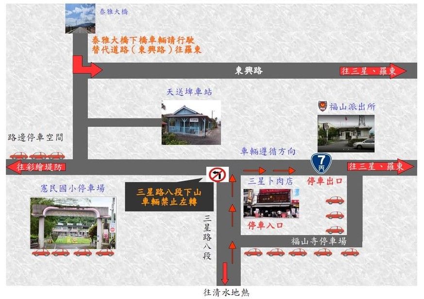 視現場車流狀況機動實施替代道路疏導。請駕駛人配合交通管制人員指揮及牌面引導;如有車流壅塞,泰雅大橋欲往東行駛車輛,請改道東興路往羅東、宜蘭市區方向行駛;另三星路八段(長埤湖下山方向)車輛禁止左轉往泰雅大橋,以維持車流順暢。