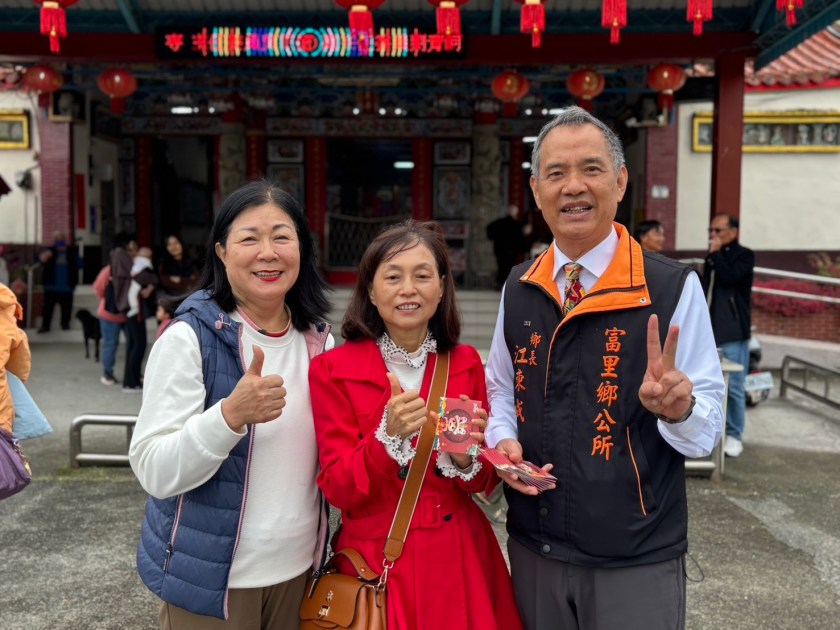 農曆新年大年初一早上,江東成鄉長親自於富里鄉各主要宮廟及公共場域發送新春福袋,向鄉親拜年賀歲,祝福大家新的一年平安順遂、闔家安康。現場洋溢濃厚年節氣氛,不少鄉親一早便攜家帶眷前來排隊領取福袋,互道恭喜,場面溫馨熱絡,展現富里鄉濃濃的人情味與團結氛圍。