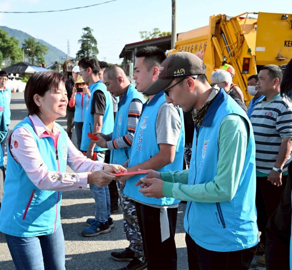「謝謝!辛苦了!」游淑貞和楊政道在清潔隊部大門口揮手提醒出車的清潔隊員注意安全,帶給清潔隊員無限溫暖和動能。吉安鄉自2月22日起全面恢復夜間正常清運,並同步提供定時定點服務。籲請鄉親配合垃圾源頭分類與減量,攜手共維宜居環境。