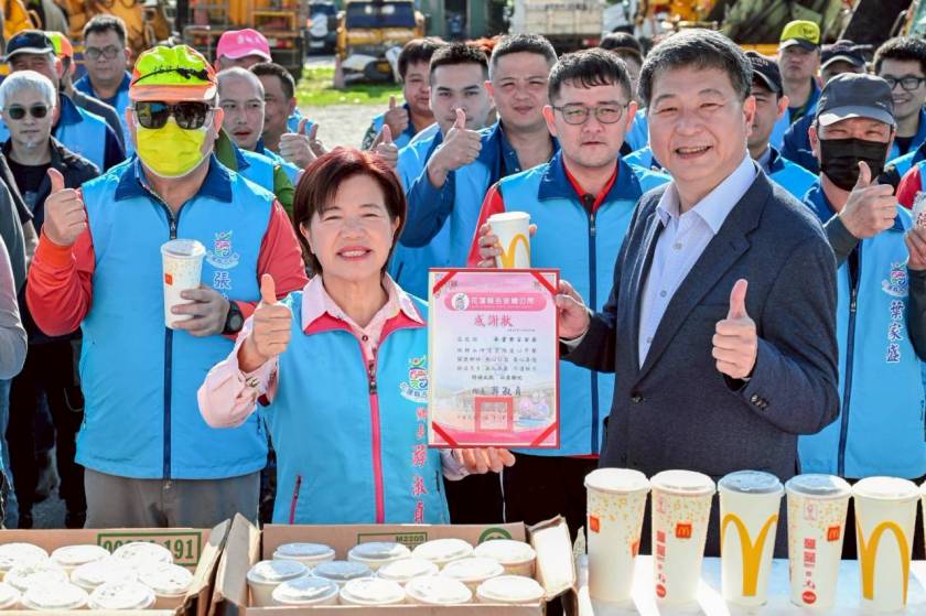大年初四清潔隊開工嘍!因家戶累積年假多日的垃圾量暴增,因應龐大清運需求,吉安鄉清潔隊於今(20)日大年初四正式開工,進行全鄉垃圾清運及回收資源工作。花蓮麥當勞董事長楊政道親送一百份溫熱且豐盛可口的「元氣早餐」套餐,為隊員們加油補充體力,以迎戰春節後的首波清運高峰。鄉長游淑貞同時頒贈感謝狀表達對楊董事長的謝意,也親為辛苦隊員加油打氣,致贈每人開工紅包,勉勵大家在繁重工作中也要注重自身安全。