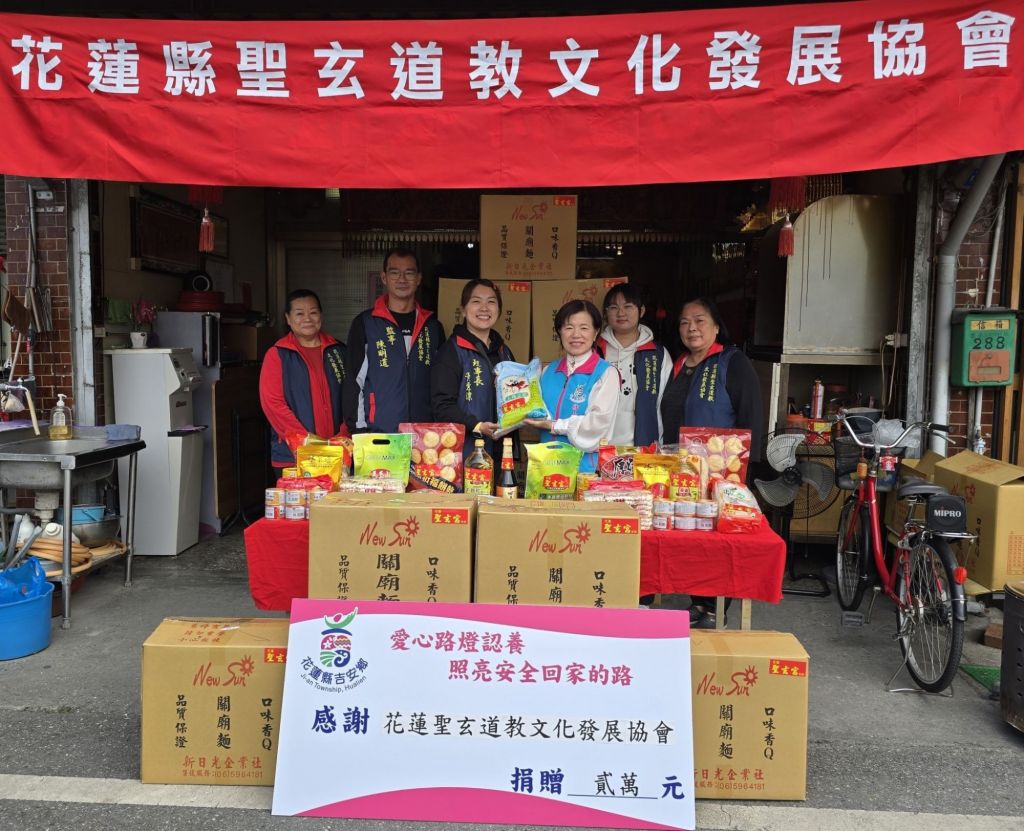 花蓮縣聖玄道教文化發展協會整合信眾愛心,捐贈30大箱綜合民生物資予吉安鄉弱勢家戶外,追加響應「認養光明路燈」計畫,今年再度認養20盞路燈,守護晚歸用路人的行車與行走安全,也為弱勢家庭補足基本生活所需。吉安鄉長游淑貞偕同社會課團隊親赴聖玄宮,致贈感謝狀予聖玄宮及花蓮縣聖玄道教文化發展協會,感謝長年善行不輟、公益不缺席。鄉公所堅守擔綱「愛心轉運站」的守護運能,確保物資與資源能夠即時、精準送達需要幫助的鄉親手中,陪伴弱勢家戶穩定生活、勇敢迎向未來。