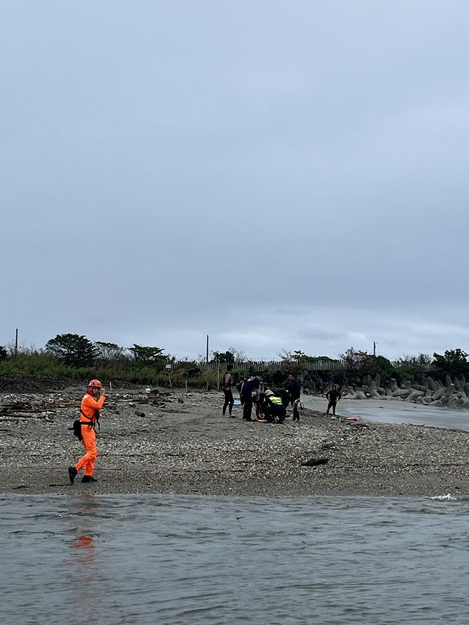 救災人車抵達現場後,發現一名民眾(男性,54歲)於海面漂浮,情況危急。消防人員隨即與現場衝浪遊客及海洋委員會海巡署人員協力展開救援,合力將患者救援上岸。