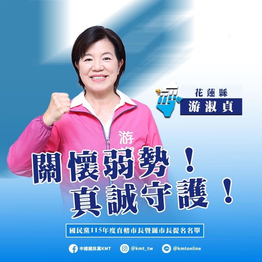 國民黨中央於今(4)日召開中常會正式通過並宣布徵召吉安鄉長游淑貞參選花蓮縣長。游淑貞也親赴黨中央,由黨主席鄭麗文親自為他披上彩帶,並鼓舞士氣,期勉「鐵人鄉長」在充滿挑戰的選戰中,守護花蓮這一方淨土。游淑貞也與同時接受徵召的雲林縣張嘉郡與金門縣陳玉珍共同攜手,象徵國民黨內女力無限,一定能延續「藍色執政、品質保證」的金字招牌,繼續為鄉親打拼。