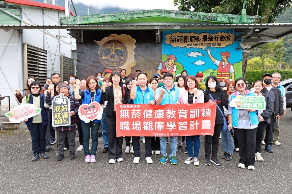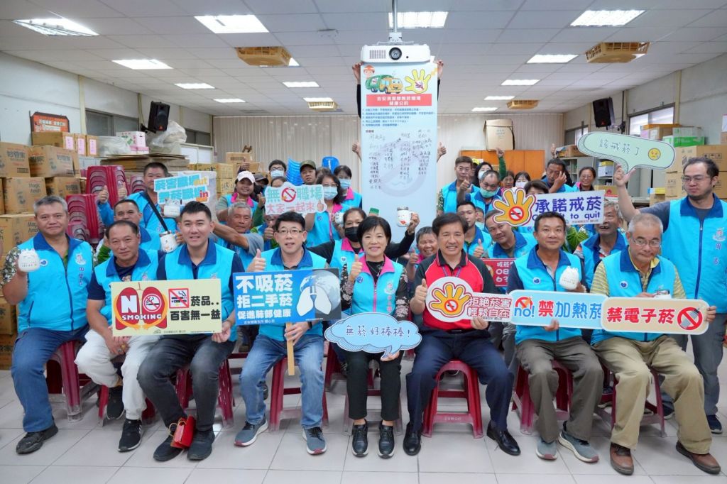 吉安鄉清潔隊在無菸職場推動上,展現極具巧思的創意作法與公私協力策略。在游淑貞鄉長全力支持下,頒布獎勵措施加碼提供成功戒菸者2,000元禮券,並推動互助的「陪伴者」制度。隊上創意設計專屬徽章,白色愛心代表「戒菸者」、藍色代表「關懷者」,讓同仁在日常中互相打氣,一句「你幾日沒抽菸了?」成為最溫暖的問候。此外,清潔隊員發揮環保專長,將廢棄物改造成寫著「每根菸都是玩命關頭」的警語造型垃圾桶,並共同創作無菸宣言彩繪牆,透過環境介入形塑無菸文化。