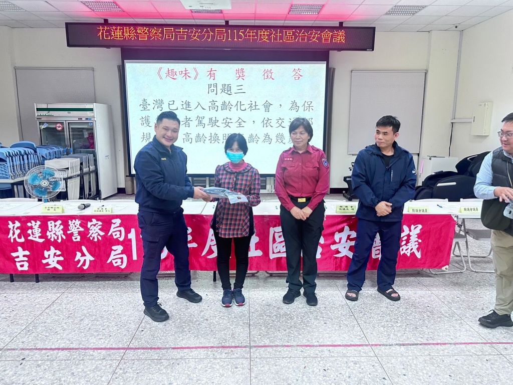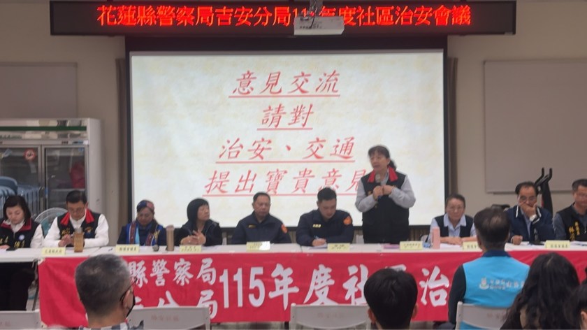 會議中,北昌、吉昌及勝安等地村民踴躍發言,針對地方治安、交通與社區環境提出多項建議,相關業務單位也逐一回應與說明,現場互動熱絡。吉安警分局表示,透過社區治安會議能拉近警民距離,傾聽地方需求並即時回應,未來也將持續結合社區力量,共同打造安全、安心的生活環境,讓民眾在良好的治安與交通環境中安居樂業。