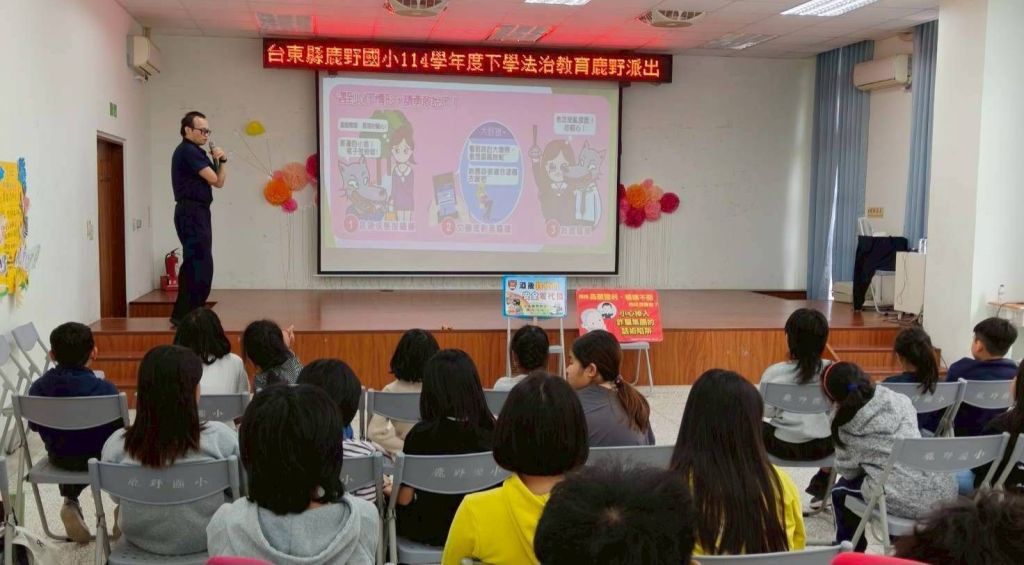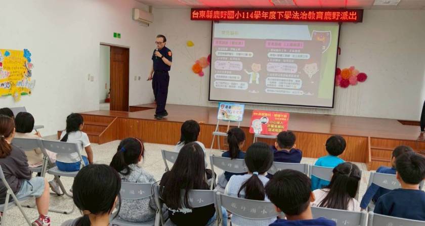 為強化學童法治觀念與自我保護能力,臺東縣警察局關山分局鹿野分駐所於今(13)日9時,受邀前往鹿野國小,參與此校舉辦的「114學年度法治教育」課程,由警員吳柏義以生動活潑的方式,向學生宣導上下學交通安全、校園霸凌防制以及網路交友與性影像外流等重要議題,透過貼近生活的案例分享,讓學生在輕鬆互動的氛圍中建立正確觀念。