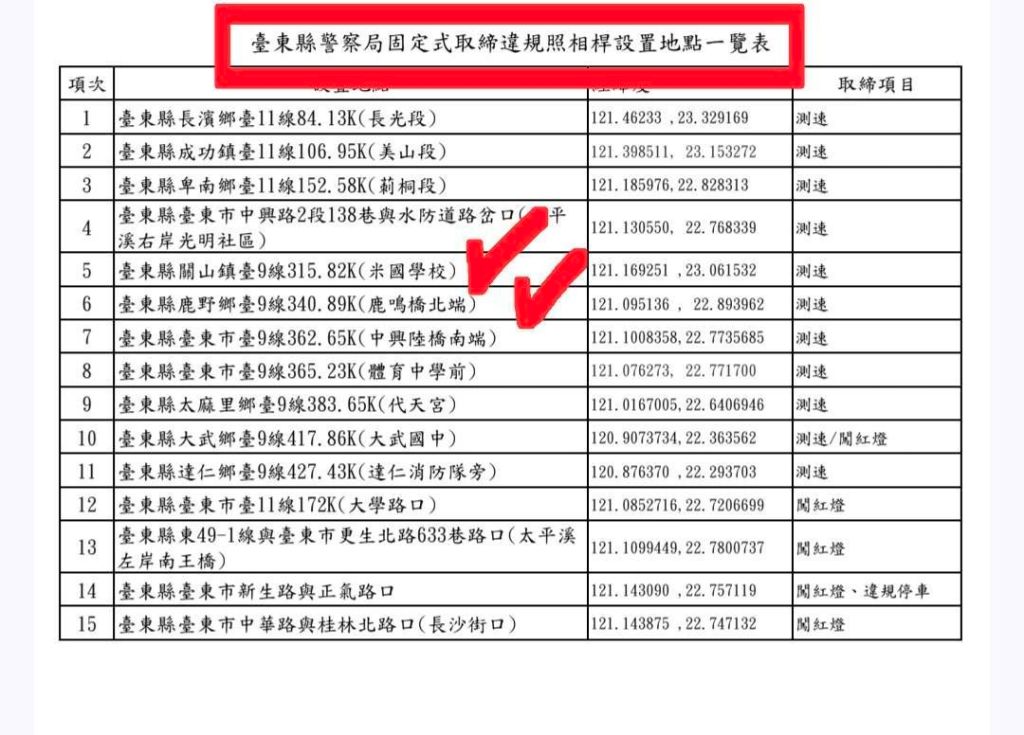 為維護道路交通安全並降低交通事故發生率,臺東縣警察局關山分局表示,轄內臺9線340.89公里處(鹿野鄉鹿鳴橋北端)新設置之固定式測速照相設備,已於(3)月正式啟用執法,提醒行經此路段之駕駛人務必依規定60公里/小時速限行駛,以維護行車安全並避免違規受罰。