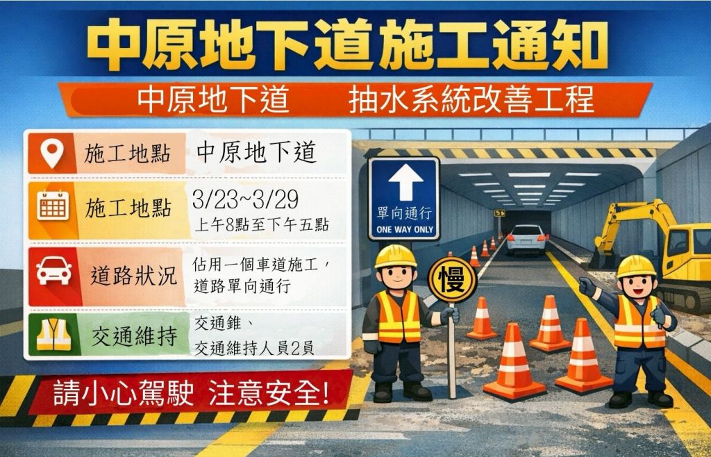 為提升花蓮市區排水效能、降低豪雨期間地下道積淹水風險,花蓮市公所將辦理「中原地下道抽水系統改善工程」,施工期間自3月23日至3月29日,每日上午8時至下午5時進行,施工期間採單向通行,提醒用路人提前改道或減速慢行,以維護行車安全。