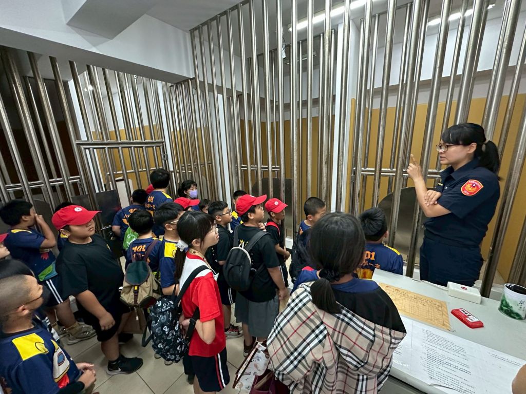 此外,學童們對警察的裝備與人犯居留環境充滿興趣,在員警的解說與帶領下,實際體驗防彈衣、警棍及無線電等警用裝備,了解其功能與用途。分局也開放人犯拘留室供師生參觀,讓孩子們了解犯罪後果,也對警察守護社會治安所付出的努力有更深刻的體會。