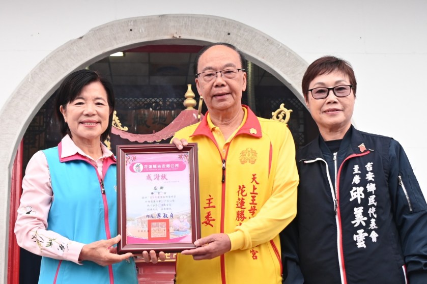 吉安鄉公所於今(28)日上午,在慈雲山懷恩堂前廣場辦理清明節祈福護靈普渡法會,現場祭祖人潮湧現千餘鄉親絡繹不絕,家屬們自備供品隨同公所法祀典儀祭拜祈福,傳承慎終追遠傳統美德。鄉長游淑貞親頒感謝狀,感謝勝安宮長期協力環保祭祀理念,年年無償提供千盞心燈祈福;同時感謝仁里、北昌、太昌、勝安、南宜昌、稻香、光華各巡守隊,分工承擔法會交通維安及懷恩祭祖清明時期之安全引導工作。