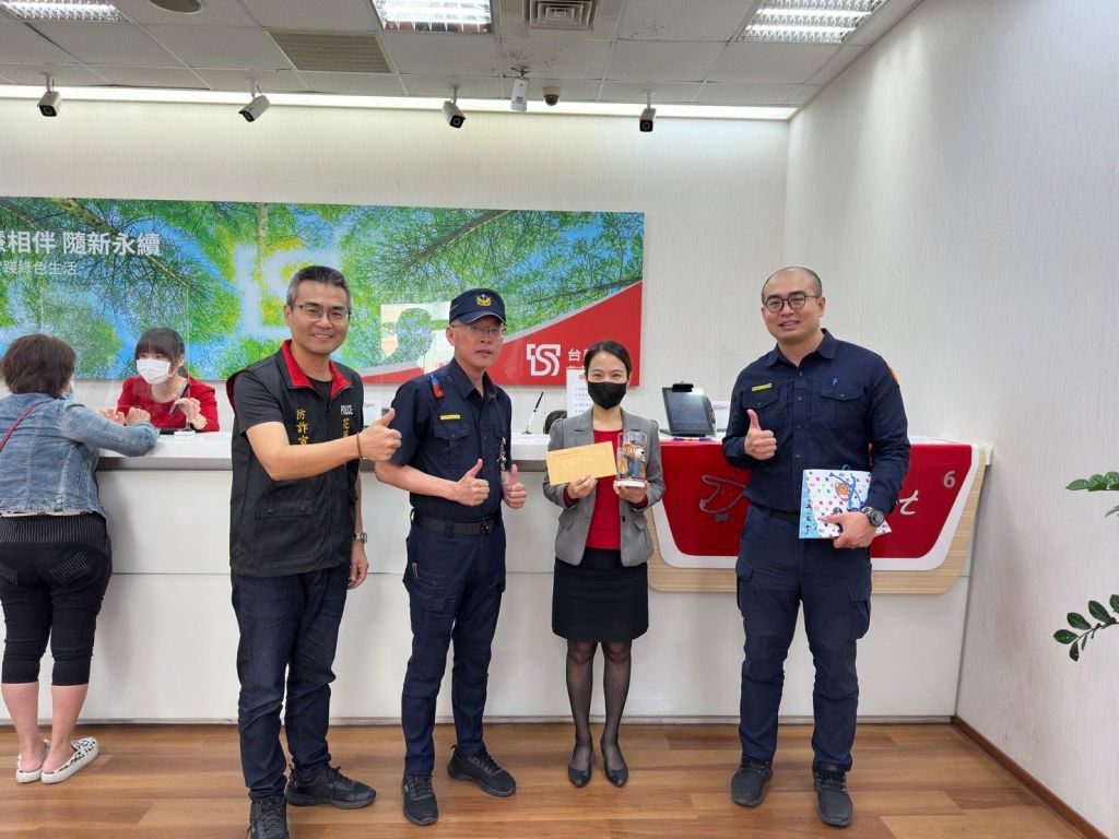 花蓮縣警察局花蓮分局為表揚金融機構行員協助攔阻詐騙案件有功,於3月31日上午由副分局長涂錞德率同偵查隊副隊長莊喬安及中山派出所所長鍾明翰親自前往台新銀行花蓮分行,頒發禮券及警察小熊玩偶紀念品,對行員機警察覺異狀、即時通報警方成功攔阻詐騙,表達高度肯定與誠摯感謝。
