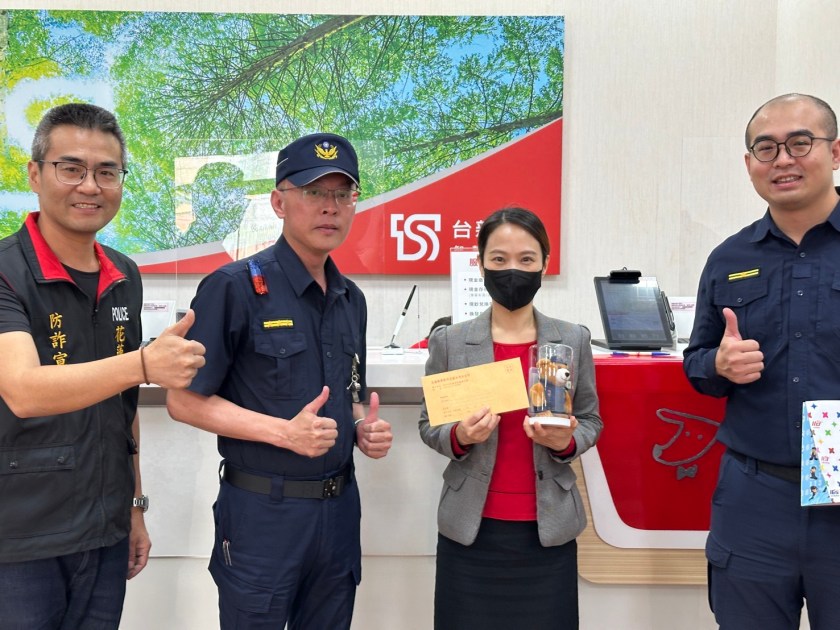 花蓮縣警察局花蓮分局為表揚金融機構行員協助攔阻詐騙案件有功,於3月31日上午由副分局長涂錞德率同偵查隊副隊長莊喬安及中山派出所所長鍾明翰親自前往台新銀行花蓮分行,頒發禮券及警察小熊玩偶紀念品,對行員機警察覺異狀、即時通報警方成功攔阻詐騙,表達高度肯定與誠摯感謝。