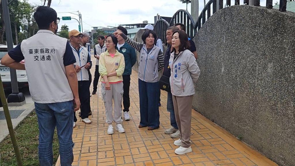 饒慶鈴與議長吳秀華、議員張國洲、黃治維、簡維國、林參天、陳志峰、楊招信、立委陳瑩、新興里里長詹益森,下午先視察臺東高中周邊人行環境改善工程,交通及養護工程處長劉俊毅說明,為提升市區步行安全與整體市容品質,針對臺東高中周邊等重點路段進行全面優化,致力打造安全、無障礙且舒適的行人通行空間。改善工程內容包括922公尺人行道鋪面更新、276公尺排水設施改善及路口通行動線優化、無障礙斜坡道、優化導盲設施及景觀綠美化等,全面提升行人通行便利性與安全性。同時,也將檢討既有設施配置,改善高低落差與破損情形,降低跌倒及意外發生風險。