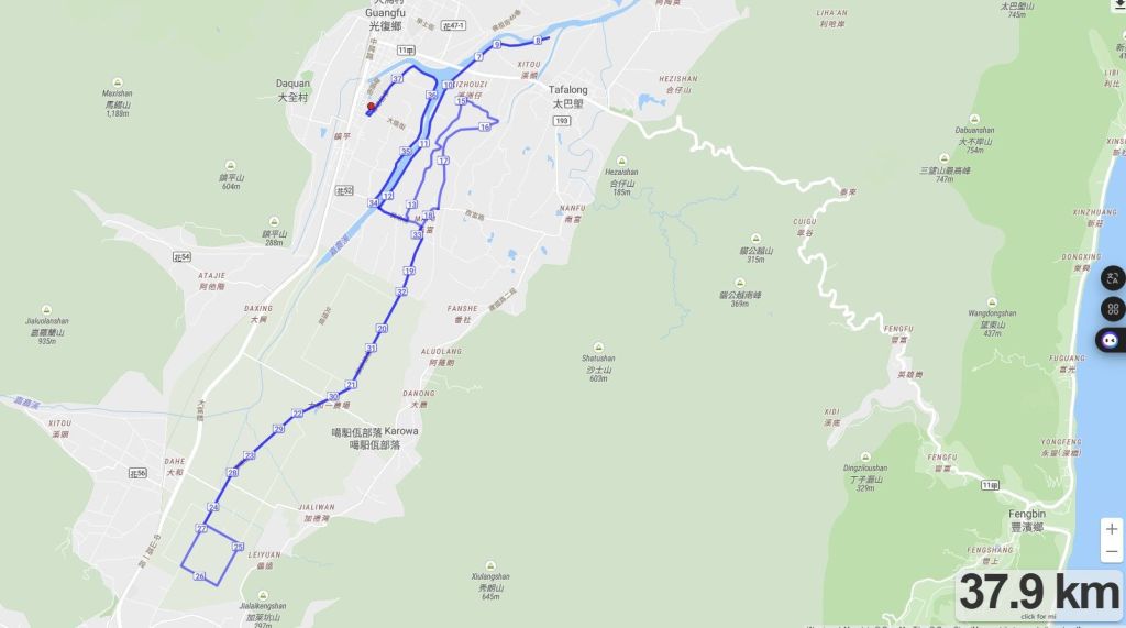3、比賽路段:光復糖廠(起點) → 糖廠街8巷 → 糖廠街→ 廠部行政大樓 → 中山路一段 → 光復橋 → 流溝道路(嘉農溪西岸) → 流溝道路與台11線交會橋下(補給站+5K 折返點) → 好望角(馬太鞍溪嘉農溪交匯口+10K21K 折返點) → 中山路一段 → 光復橋 → 糖廠街→ 林田幹線 → 民治街 → 馬佛二橋 → 流溝道路 → 西富路民有街口 → 民有街(聖若瑟教堂) → 民有街51巷 →魚的家露營地 → 大農大富平地森林園區自行車道 → 中央觀景台 → JULY 咖啡(花48線道路口折返) → JULY咖啡 → 大農路 → 中央觀景台 → 魚的家露營地 → 民有街51巷 → 西富路民有街口 → 民治街 → 林田幹線 → 糖廠街 → 光復糖廠(終點)。