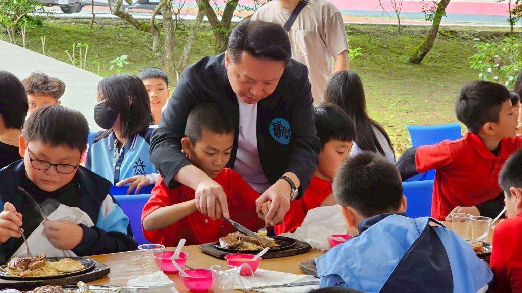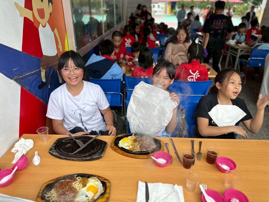 中午用餐時段,天候涼爽宜人,志工團隊分工合作,端出熱騰騰的玉米濃湯與清涼紅茶,現煎牛排香氣四溢、滋滋作響,讓現場充滿歡笑與滿足。學童們大快朵頤,臉上洋溢著幸福笑容。