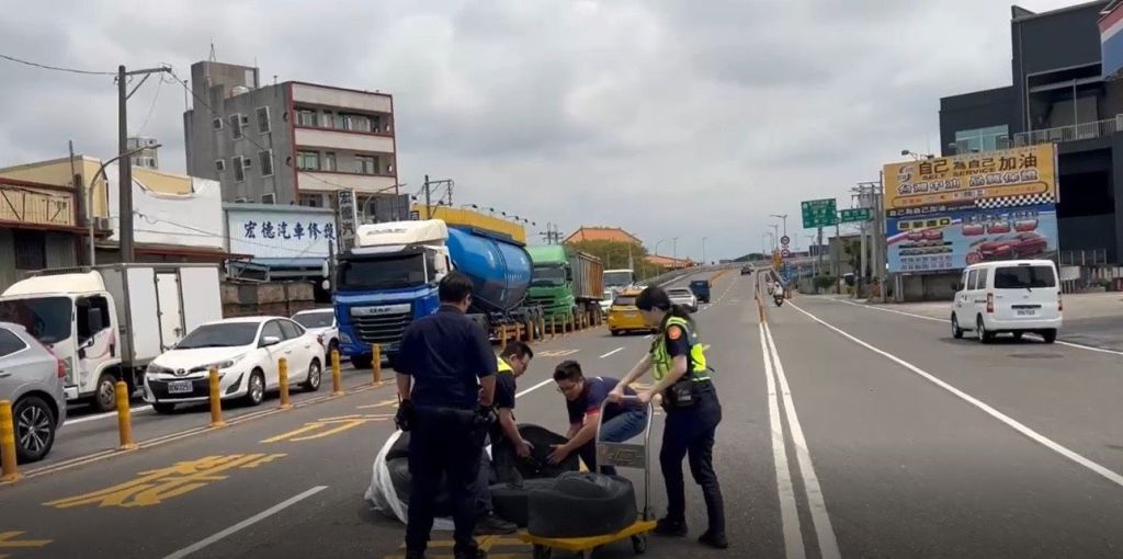 高雄市政府警察局湖內分局湖街派出所副所長歐志昌、警員黃子芸日前執行巡邏勤務時,行經湖內區竹湖陸橋前,發現竹湖陸橋快車道散落多件大型物品,影響後方車流及行車安全。