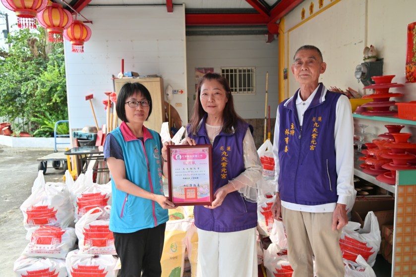 吉安鄉紫元宮今(7)日為濟助弱勢並響應鄉長游淑貞照顧弱勢與推動社會福利與服務工作,捐助483斤白米與90份綜合物資,由鄉公所社會課長何書咏代表接受並回贈感謝狀給宮主沈秀蘭,相關物資將由公所社會課造冊,分贈給鄉內弱勢家庭,幫助家戶生活。