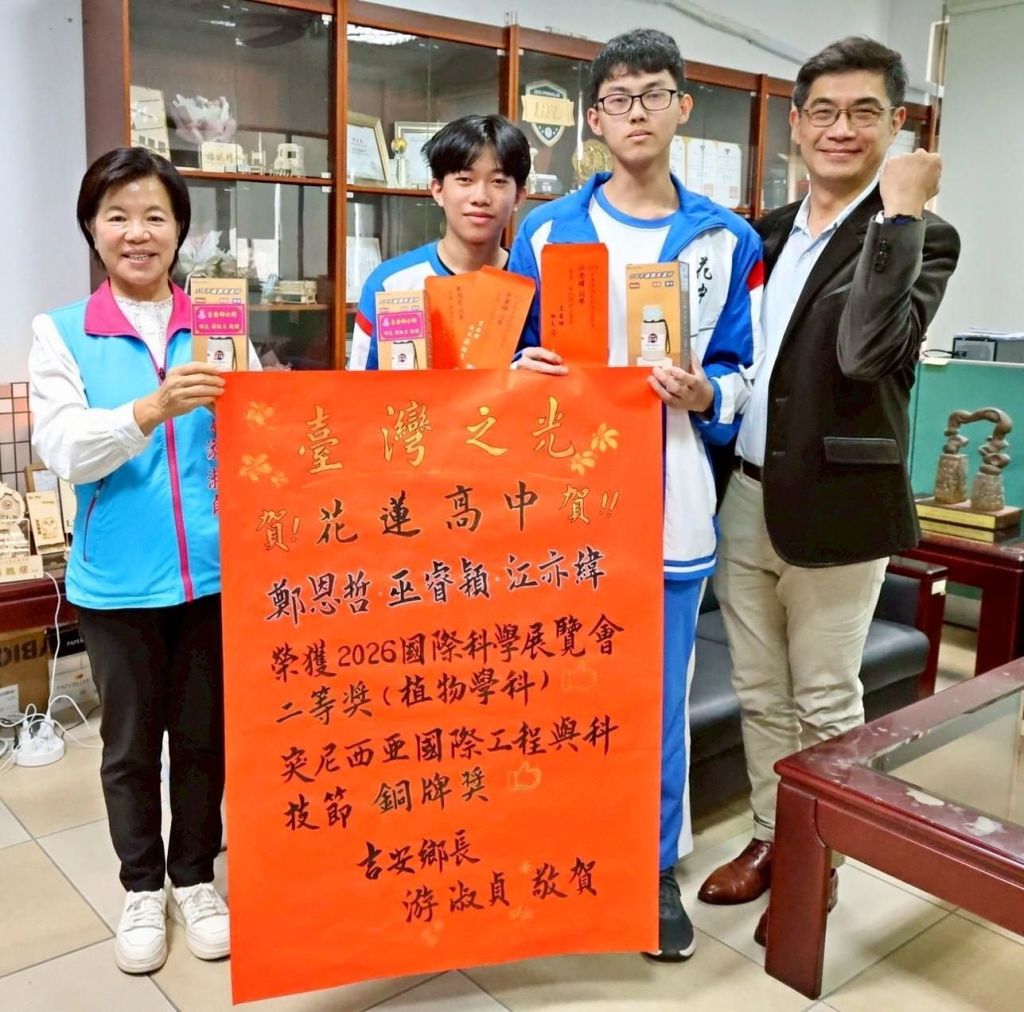 日前設籍吉安鄉的花蓮高中學生鄭恩哲、巫睿穎和同儕江亦緯,憑藉著對科學研究的熱忱與紮實的實驗基礎,在「2026年臺灣國際科學展覽會」中脫穎而出,一舉奪下「植物學科」二等獎及代表國家前往突尼西亞參展贏得銅牌的殊榮。為肯定學生卓越表現,鄉長游淑貞今(7)日上午由民政課團隊陪同,親赴校園貼紅榜慶賀,除了肯定校長及師長們作育英才、培養無數學子發展興趣專長研究、完成夢想,更勉勵學生們在科研道路上持續精進。