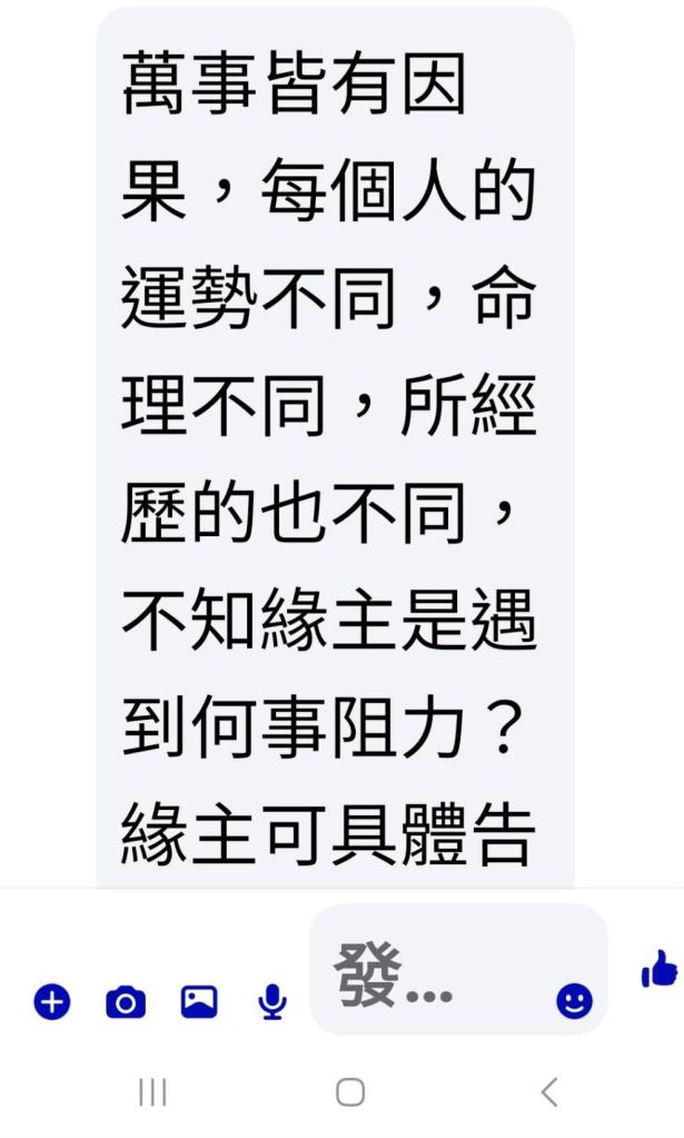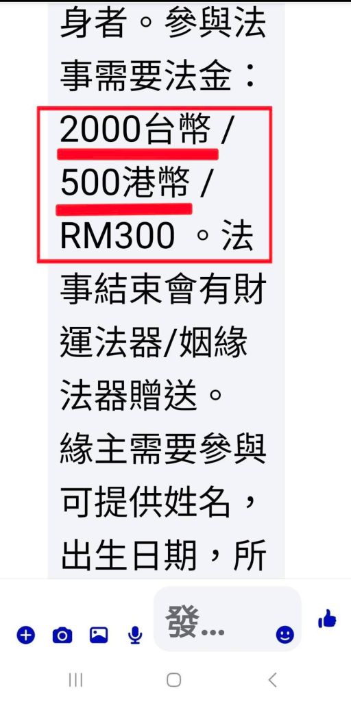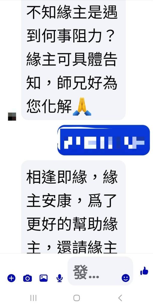 所長蔡欣妤表示,張女日前於社群平台瀏覽宗教相關廣告後,遭一名陌生帳號主動聯繫,對方透過通訊軟體長期傳送佛門修行及法會資訊,並自稱來自「西藏某寺廟」,藉此營造專業與神秘形象,逐步取得信任。期間對方更以關懷語氣表示:「緣主,我佛所修乃大道,你之修行現已出現問題,心亂則萬事難安,切記不可焦躁,不論發生什麼,我佛本師菩薩都會庇佑你」,使張女降低戒心。隨後對方進一步提出可代為辦理「超渡法會」,聲稱可祈福消災、改善運勢,並表示「參與法事需要法金」,要求支付費用,甚至提及完成法事後將贈送「財運法器」及「姻緣法器」等,以增加吸引力,誘使被害人匯款。張女於對方要求匯款之際,驚覺對方要求保密且內容可疑,隨即提高警覺,未依指示匯款,並立即前往池上聯合所諮詢。員警受理後,協助檢視相關對話內容,研判為典型假借宗教名義之詐騙手法,並依規定受理165反詐騙諮詢案件,提醒其後續防範作為。