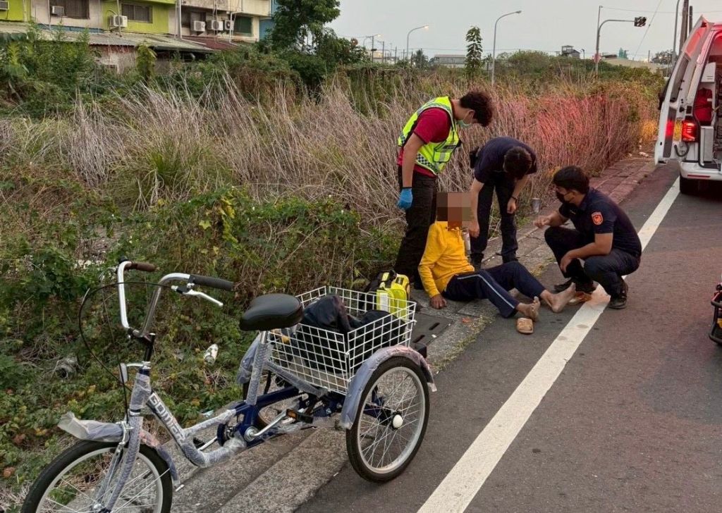 屏東縣政府警察局里港分局九如分駐所於日前晚間接獲110報案,指稱九如鄉東寧路209巷有一名老翁騎乘自行車疑似體力不支倒臥路旁。警方立即派遣警員蔡宗穎、鍾偉成及陳俊嘉趕赴現場協助,並通知119救護人員到場支援,經關懷處置後協助聯繫家屬將老翁平安接返。