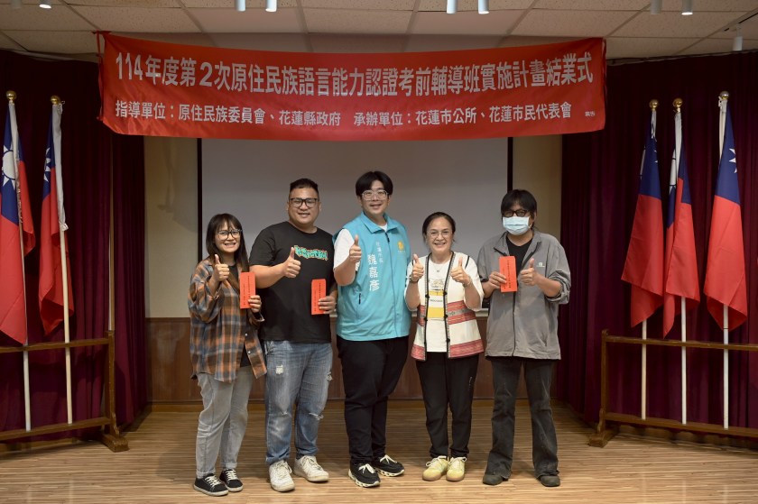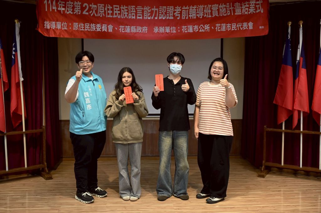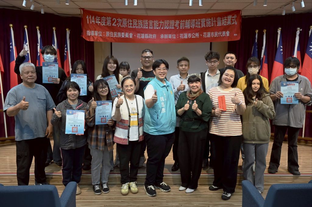 為推動原住民族語言傳承,花蓮市公所日前開辦撒奇萊雅、阿美及太魯閣三項族語認證輔導班,共吸引36位族人踴躍參加,並於日前舉行結業式。市長魏嘉彥親自出席,頒發結業證書予學員,並致贈感謝狀給三位講師嚴麗、汪秀萍及鄭以晨,感謝其專業教學與用心付出。