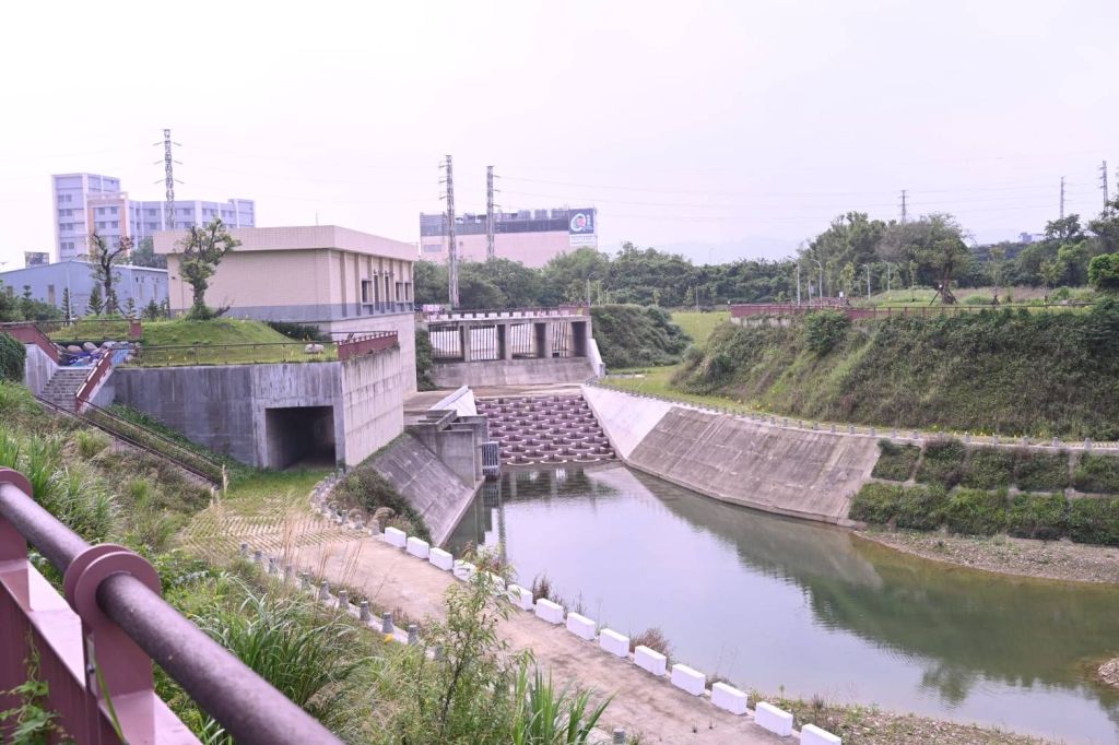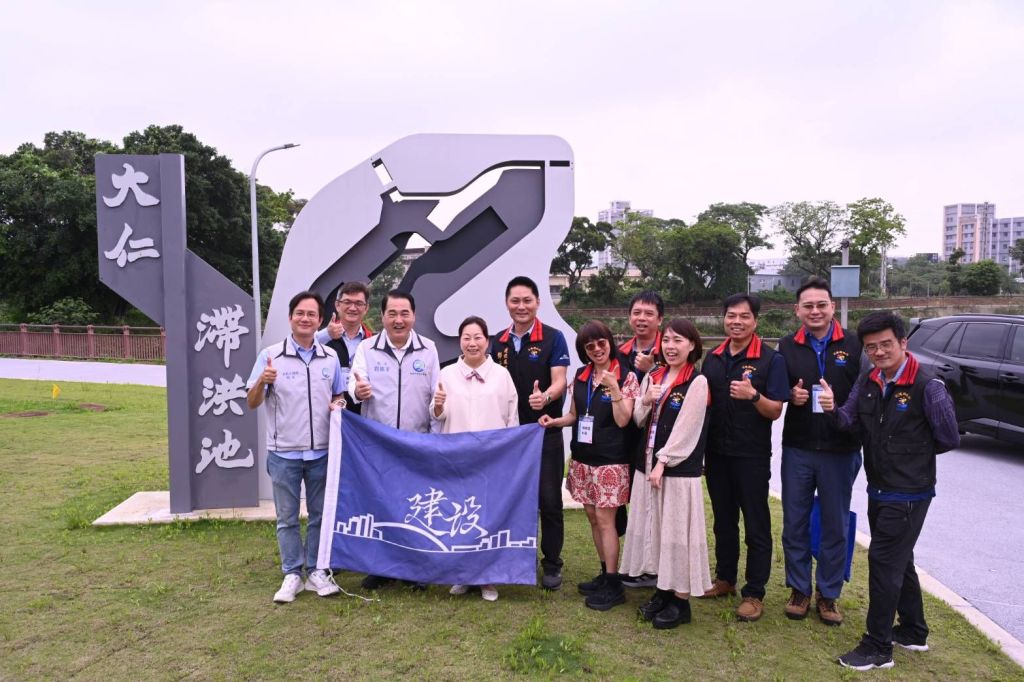 徐縣長首站抵達大仁滯洪池,由桃園市政府水務局長劉振宇及團隊接待。水利工程科科長鍾源康現場簡報指出,大仁滯洪池總經費達8.34億元,具備 13.4萬立方公尺的滯洪容量,能有效調節東門溪洪峰流量,是守護下游龜山產業園區及周邊聚落的重要防洪設施。大仁滯洪池在設計上保留了近九成的原生樹木,並規劃環場步道、魚鱗階梯與藝術裝置,不僅解決淹水問題,更成功將公共設施轉化為市民休憩的綠地場域,其公私協力認養綠化的模式亦值得借鏡。