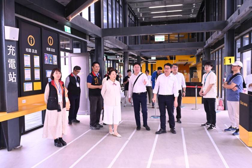 隨後徐縣長一行前往八德轉運站考察,由桃園市政府交通局主任秘書宋嘉修代表接待。八德轉運站於113年2月啟用,緊鄰大湳交流道,其貨櫃造型的2層樓站體不僅呼應桃園航空城意象,更選用可回收材料體現資源永續目標。交通局團隊在交流中分享了轉運站的運作模式,包含如何透過鄰近路口交通號誌優化,以及引進「桃小巴」等微型運具來提升接駁靈活性,讓大眾運輸能因地制宜,確實滿足民眾通勤的最後一哩路。