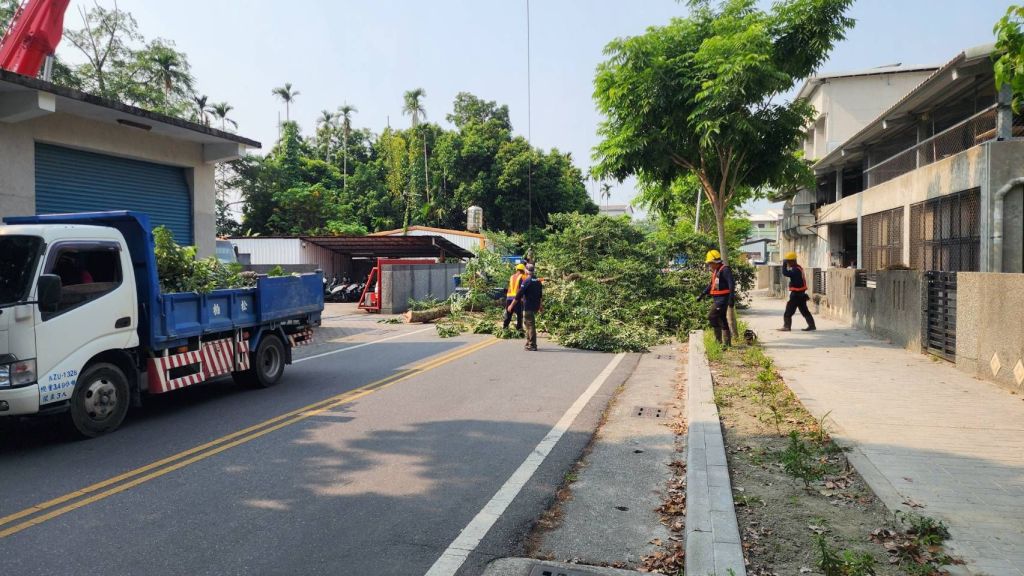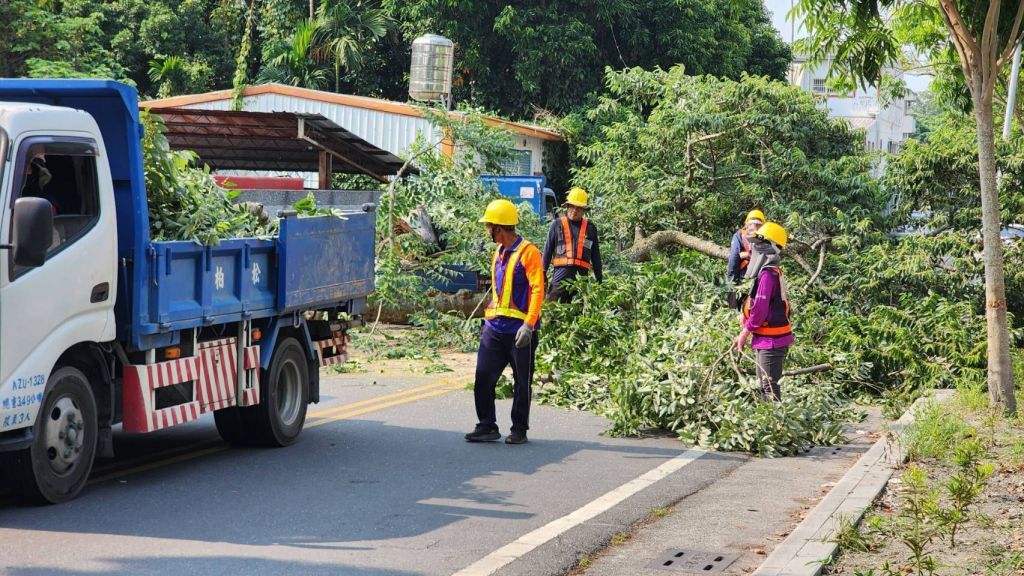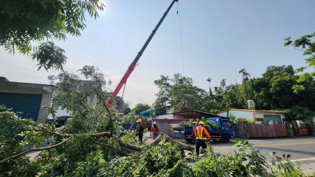 關山警分局隨即展開查證,確認此處樹木係財政部國有財產署南區分署臺東辦事處所轄,立即主動去函協調處理。相關單位接獲通知後高度重視,迅速安排專業人員與機具進場處理,展現跨機關合作的高效率與行動力。於今(17)日8時許,國產署臺東辦事處派遣2部吊車及多名工程人員,在警方協助下進行現場安全管制與交通疏導,整體作業過程嚴謹有序。工程人員透過高空作業,逐步將垂落且具風險的樹枝進行切除與清運,最終順利完成任務,成功排除潛在危害,確保周邊住戶及往來民眾安全無虞。組長張珈源表示,面對極端氣候日益頻繁的情形,各項防災整備工作更顯重要,此次與國產署臺東辦事處的合作,不僅有效降低災害風險,也展現政府機關間橫向聯繫與資源整合的良好典範。透過事前預警與即時處置,讓危險止於未發,正是守護民眾生命財產安全的關鍵。