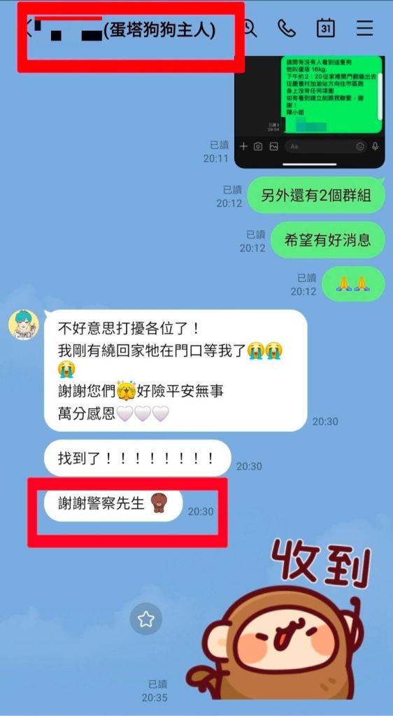 所長李貫豪表示,當時警員林威豪見陳女神情緊張,甚至淚水在眼眶中打轉,顯見其與愛犬感情深厚,立即上前關心並協助處理。林員在了解情況後,隨即請陳女提供狗狗近照,並迅速轉發至地方社團及社區民眾所成立的Line群組中,透過在地力量擴大協尋範圍,盼能儘速尋回走失的毛小孩。