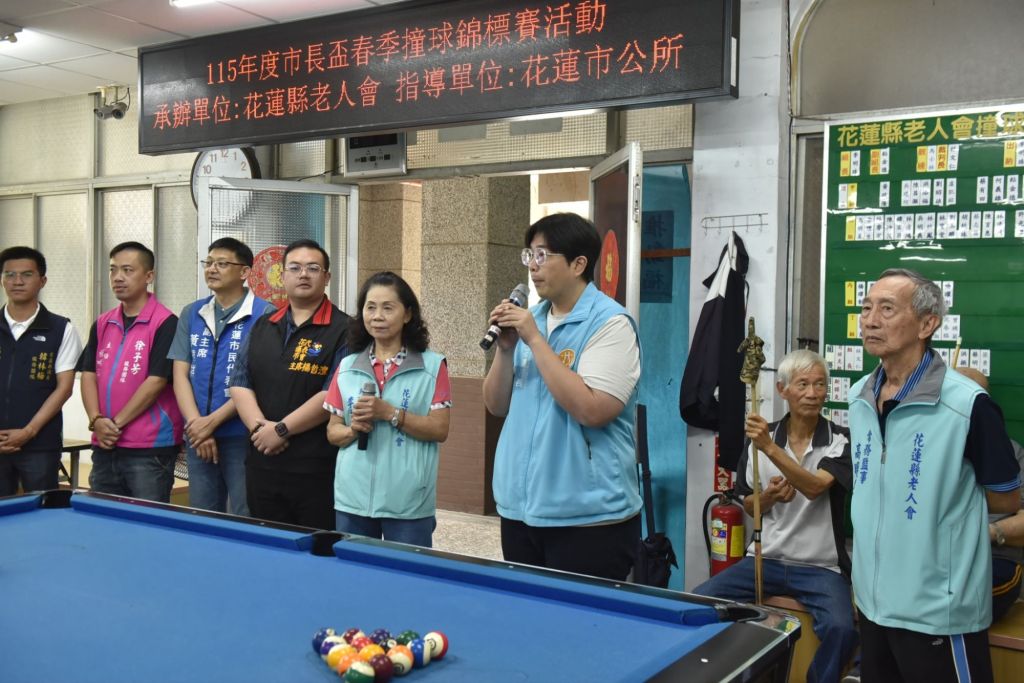 為了鼓勵銀髮族參與正當康樂休閒活動,花蓮縣老人會(17)日舉辦「115年度市長盃春季撞球錦標賽」,逾百位長者共聚一堂,互相切磋球技;魏嘉彥市長與市民代表會主席楊哲灃、副主席黃達祥都到場跟長輩們致意,祝福大家都能發揮最好的狀態,一桿進洞。
