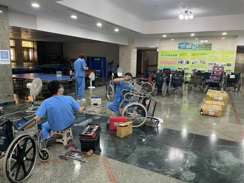 維修現場中,維修人員細心檢視輪椅結構與功能狀況,進行拆解保養與精準調整,展現高度專業與效率;同時也協助醫院進行輔具整體盤點與維護,強化院內輔具管理機制,確保各項設備維持最佳使用狀態。