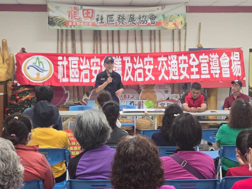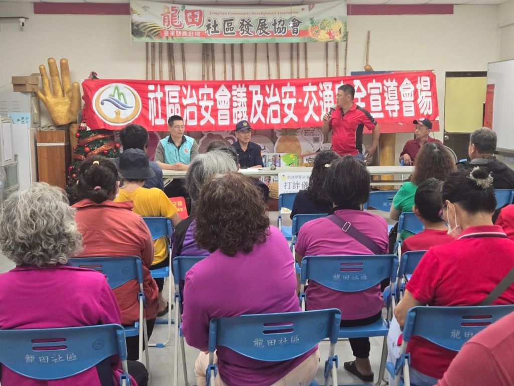 臺東縣鹿野鄉龍田村於昨(21)日19時,在龍田村活動中心召開「社區治安會議」,由村長蔡登源主持,邀請臺東縣警察局關山分局交通組巡官俞宏濂、防治組警員胡大志、鹿野分駐所所長陳泰山、警員林育平及馮文威等人到場,進行防詐騙與交通安全宣導,並結合消防隊及社政單位推廣防災知識與各項補助措施,吸引地方鄉親參與,現場互動熱絡。