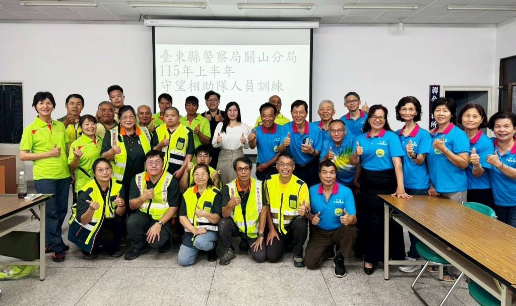 臺東縣警察局關山分局於昨(22)日18時30分許,在分局2樓禮堂舉辦「115年上半年守望相助隊人員訓練」,召集轄內巡守人員參與,透過多元課程與實務操作,全面提升社區守望相助能量,攜手打造安全宜居的生活環境。