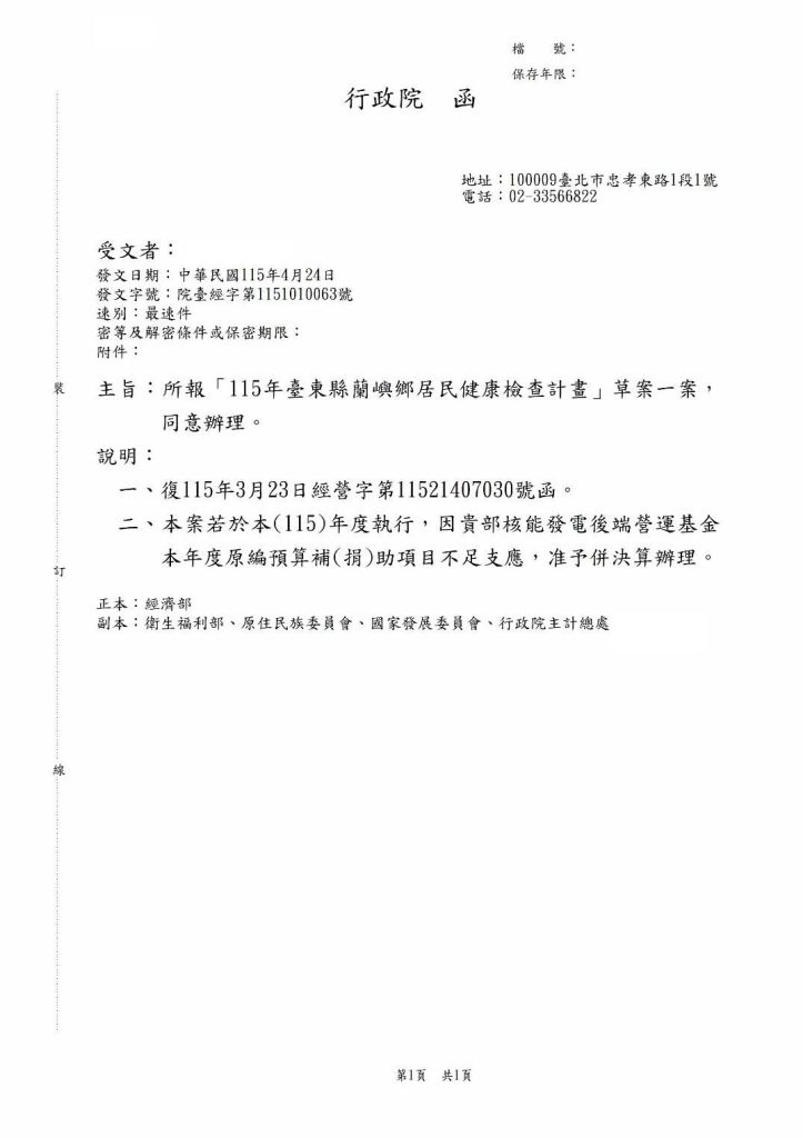 立委陳瑩長期關注蘭嶼醫療與健康權益,去年向行政院爭取「蘭嶼居民健康檢查」,行政院今(24)日正式核定計畫,總經費約9,121萬元,預計將有5,300位蘭嶼居民及相關人員受惠,衛福部立刻啟動相關作業,預計七月開始進行健康檢查。陳瑩表示,這是政府照顧蘭嶼居民應負的歷史責任!