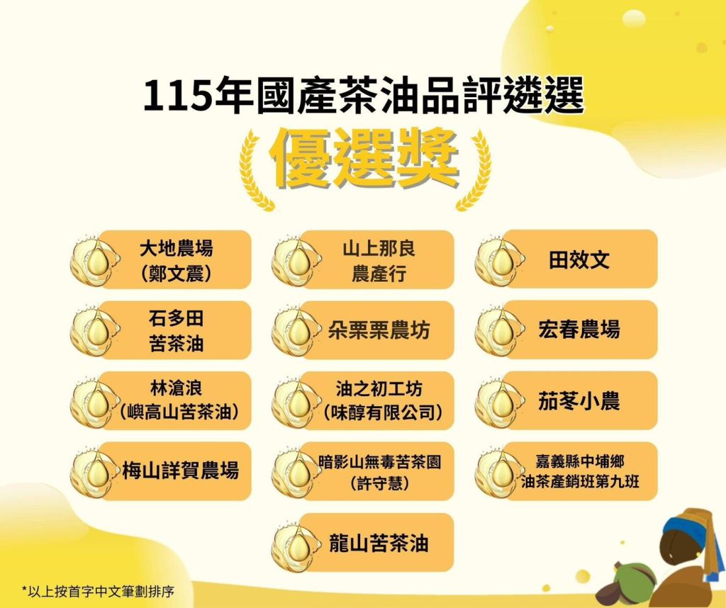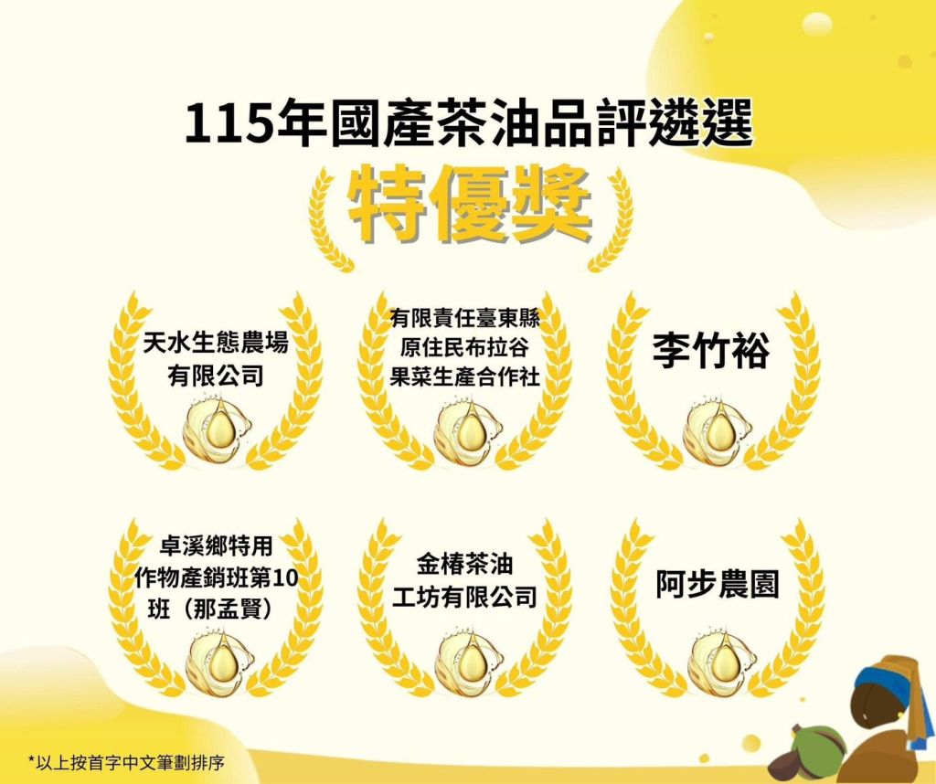 「115年度國產茶油品評遴選」結果揭曉,花蓮產區在全台35家入選第二階段品評品牌中脫穎而出,一舉拿下8項獎項,整體囊括全台近四成獎項、表現亮眼。其中象徵最高品質肯定的特優獎全台6席,花蓮即占3席、比例達50%;優等獎全台13席,花蓮獲得5席,顯示花蓮苦茶油品質與品牌實力已躍居全國指標。