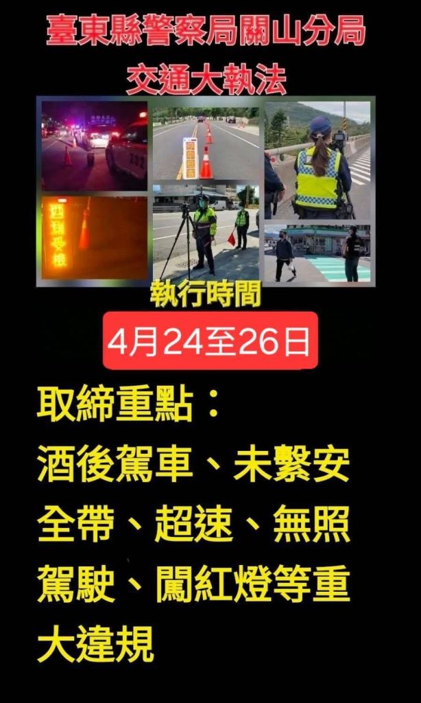為有效降低交通事故發生、守護臺東縣用路人安全,臺東縣警察局關山分局將於115年4月24日至26日啟動為期三日的「交通大執法」專案,針對轄內易肇事路段、時段及違規熱點,規劃精準執法勤務,全面加強取締各類交通違規行為,展現維護交通秩序的決心。